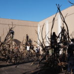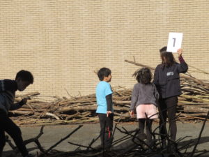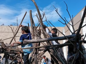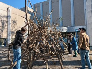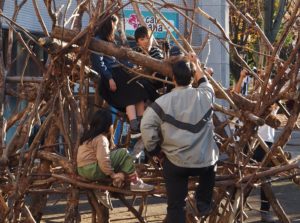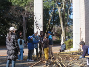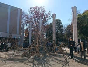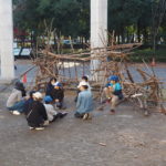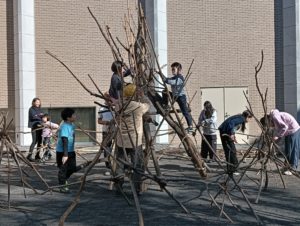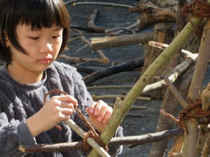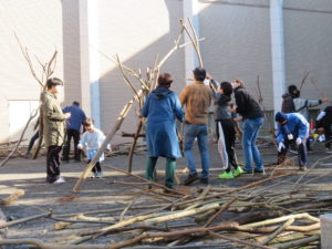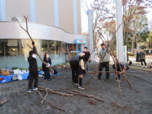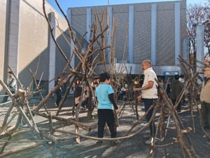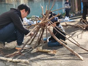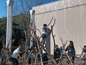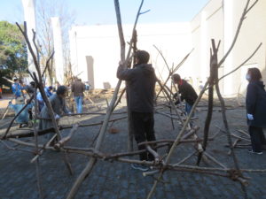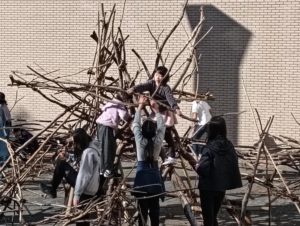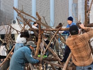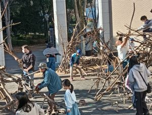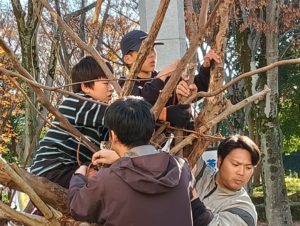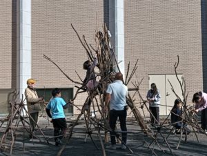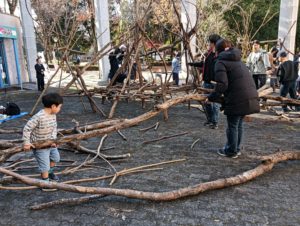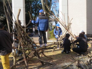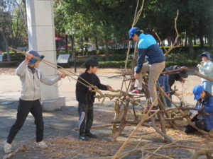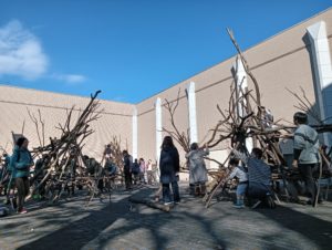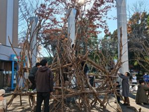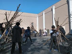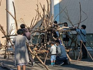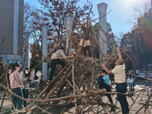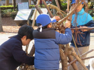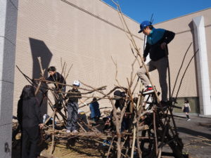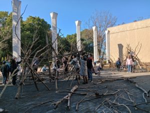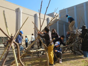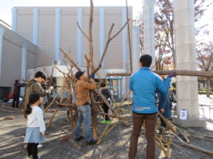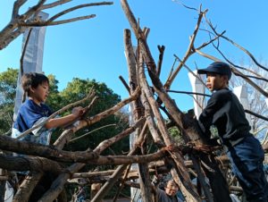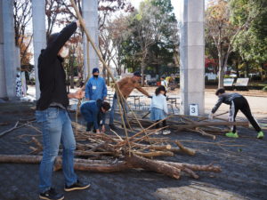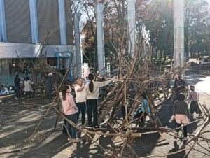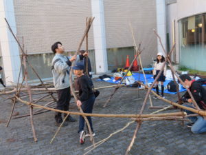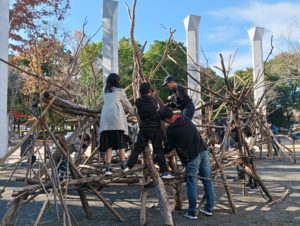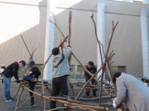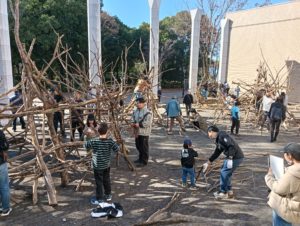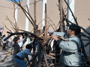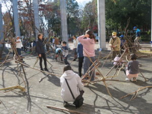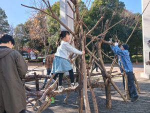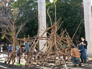 自然木の枝(直径約10cm、長さ3m程度)を使い、重さや質感を感じながら、釘や接着剤を使わずシュロ縄で結ぶという原初的な動作で組み上げます。 はじめはグループで思い思いの場所に作った小さなオブジェを、徐々につなげて、最終的にはひとつの大きな造形物を作ります。