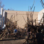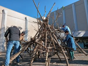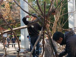 参加者の方たちのお昼休み、スタッフは木組みのシュロ縄の縛れ具合を確認します。