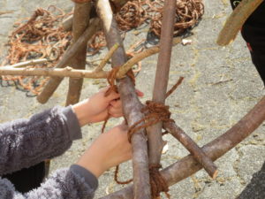 ⑩ <結び方の説明> 3本の枝で三角形の面を作ると強くなる。最少6本の枝を組むことで強い立体ができるので、そこから枝を増やしたり、それらを組み合わせたりしていきます。